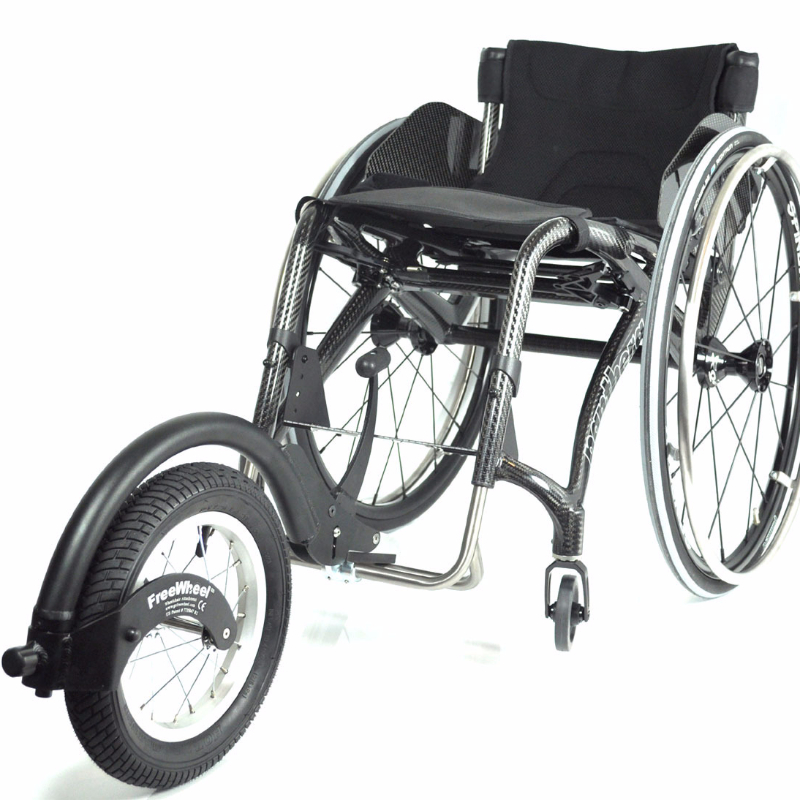 Pequeña rueda adicional para silla de ruedas. Se coloca anclada al reposapiés de la silla y permite el uso en terrenos irregulares. Muy compacta, puede guardarse en el respaldo de la silla.