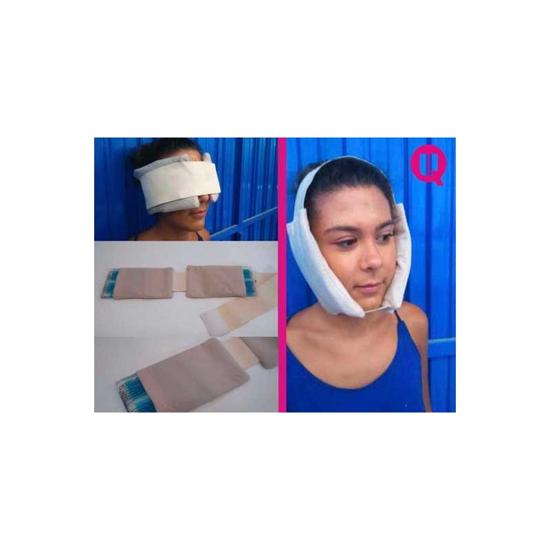 Bolsas de gel frío ajustables mediante una suave bolsa con cierre de velcro. Diseñada para dolor de muelas o postoperatorios maxilo faciales. Incluye una banda y dos bolsas de gel para frio – calor reutilizables.